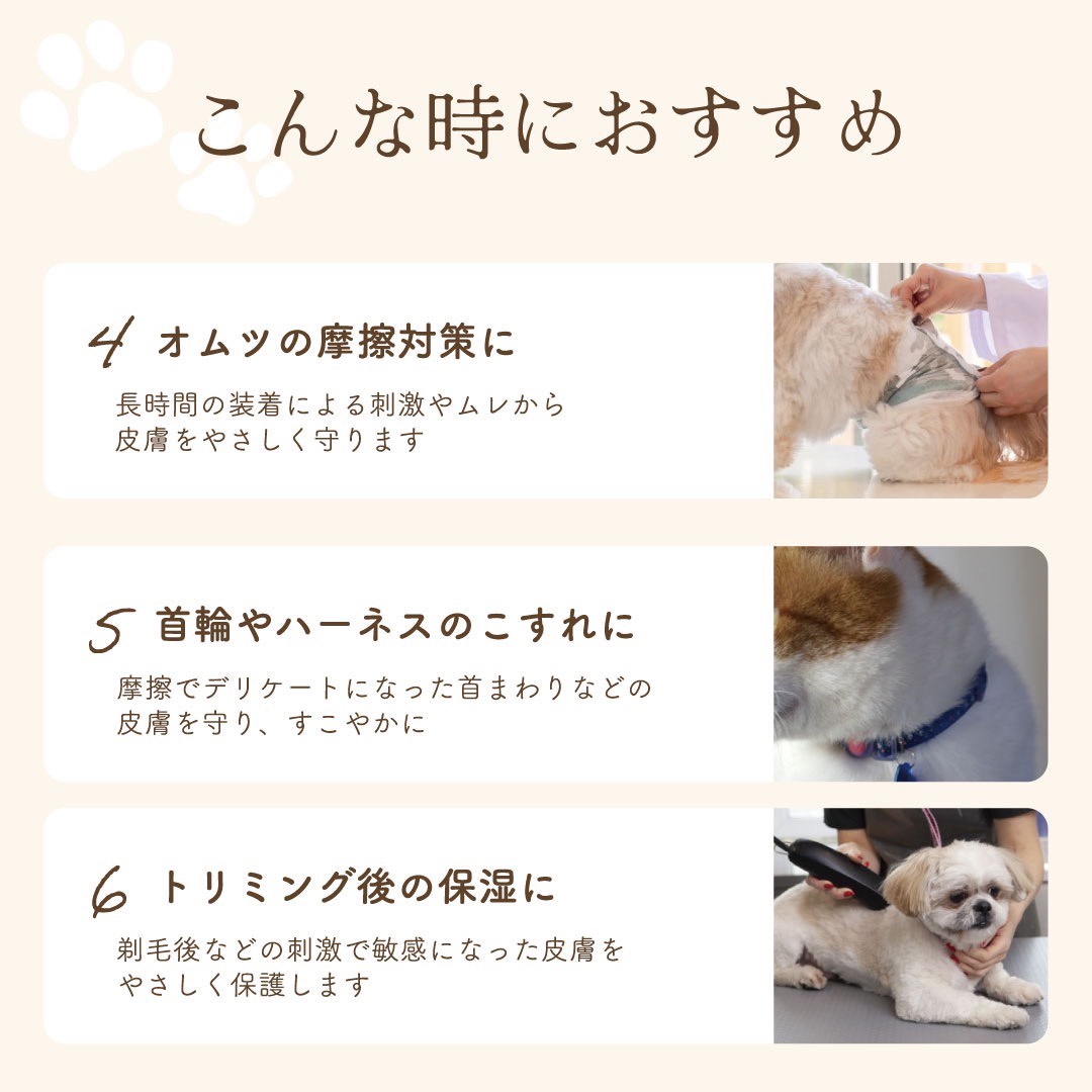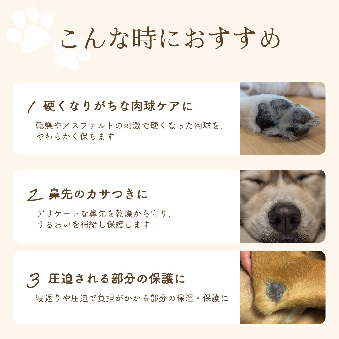●肉球や鼻、ひじ、お腹など、乾燥や荒れが気になる部分にうるおいを与え、すこやかな皮膚環境へ導きます。