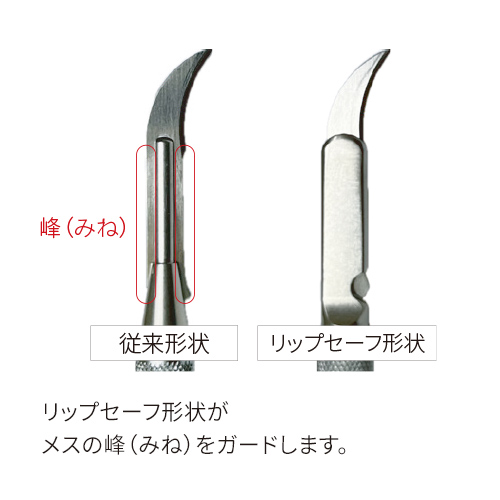 ・リップセーフの形状がメスの峰(みね)をガードし、口角や粘膜へのあたりを和らげ痛みを軽減します。※メス装着部幅:6.8mm・リップセーフの形状がガイドとなり、メスの取り付けがスムーズです。