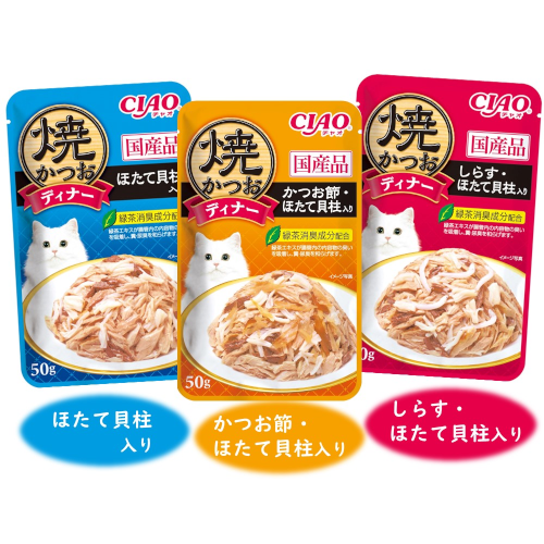 ●かつお、ほたて貝柱、ほたてエキス、かつお節、寒天、糖類(オリゴ糖等)、でん粉、植物性油脂、ミネラル類(Na、P、Cl)、増粘安定剤(増粘多糖類、加工でん粉)、調味料(アミノ酸)、ビタミンE、紅麹色素、緑茶エキス