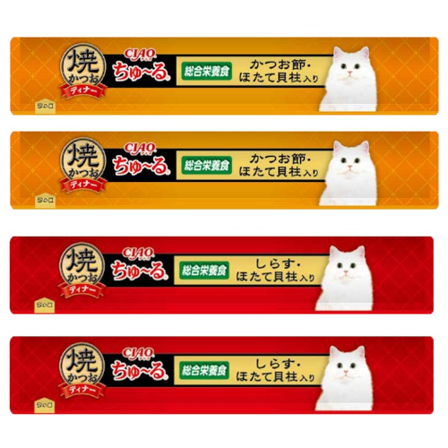 ●かつお、鶏脂、ほたてエキス、かつお節、ほたて貝柱、糖類(オリゴ糖等)、植物性油脂、増粘安定剤(加工でん粉、増粘多糖類)、ミネラル類(Ca、Cu、Mn、Zn、I、Fe、Na、P、Cl、K)、ビタミン類(A、E、B1、B2、B6、K、コリン、ビオチン、葉酸)、調味料(アミノ酸)、紅麹色素、タウリン、緑茶エキス