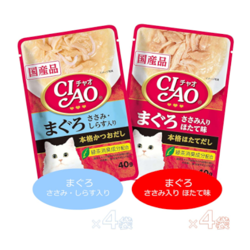 鶏肉(ささみ)、まぐろ、しらす、かつお節エキス、糖類(オリゴ糖等)、植物性油脂、増粘安定剤(加工でん粉、増粘多糖類)、ミネラル類(Na、P、Cl)、調味料(アミノ酸)、ビタミンE、紅麹色素、緑茶エキス