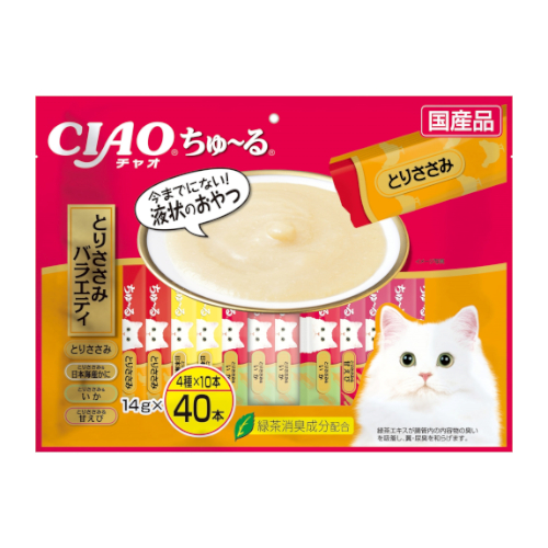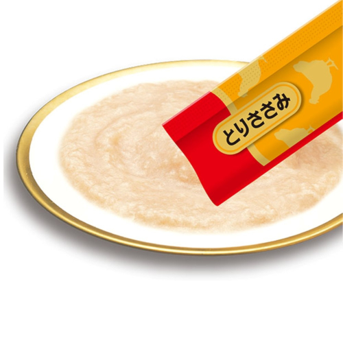 【とりささみ】鶏肉(ささみ)、ほたてエキス、糖類(オリゴ糖等)、植物性油脂、増粘安定剤(加工でん粉、増粘多糖類)、ミネラル類、調味料(アミノ酸)、ビタミンE、緑茶エキス、カラメル色素、カロテノイド色素