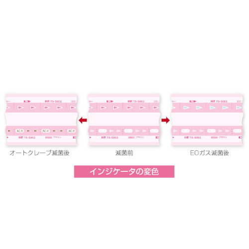 ・オートクレーブ処理後、「AC済」の文字が褐色で現れます。EOガス滅菌処理後は、ピンク色のインジケータが水色に変わります。