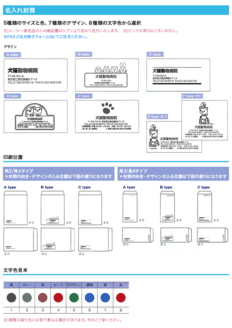 ※メーカー直送品のため商品はメーカーより、納品書はシグニより別々のお届けとなります。 ※ピンクの角3はございません。 ※わんにゃんプリント名入れサービスについては、ご利用前にシグニFAXご注文冊子の注意事項をお読みになり、名入れ封筒ご注文用紙(フォーム5)にてご注文ください。 >価格表はこちら