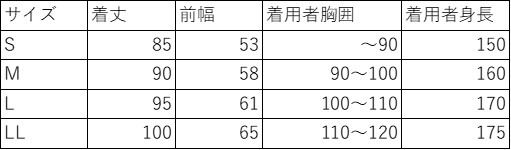L:前丈:108、前幅:58、着用者胸囲:100〜110、着用者身長 170